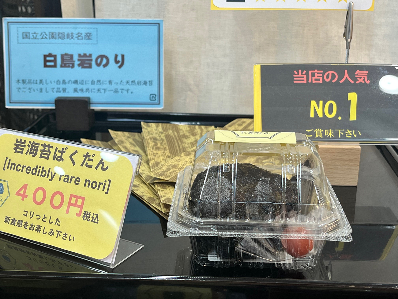 なかでも人気ナンバー1なのが国立公園の白島で手摘み採取された岩海苔を使った<岩海苔ばくだん>。