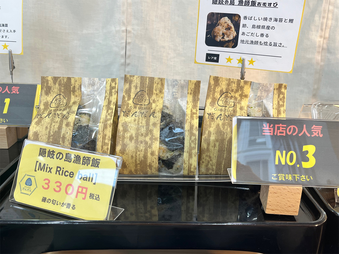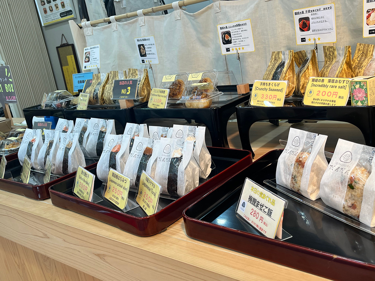 ほかにも<子持ちきくらげおむすび>、<焼き小醤油味噌おむすび>、<隠岐の藻塩むすび>とバリエーションも豊富です。