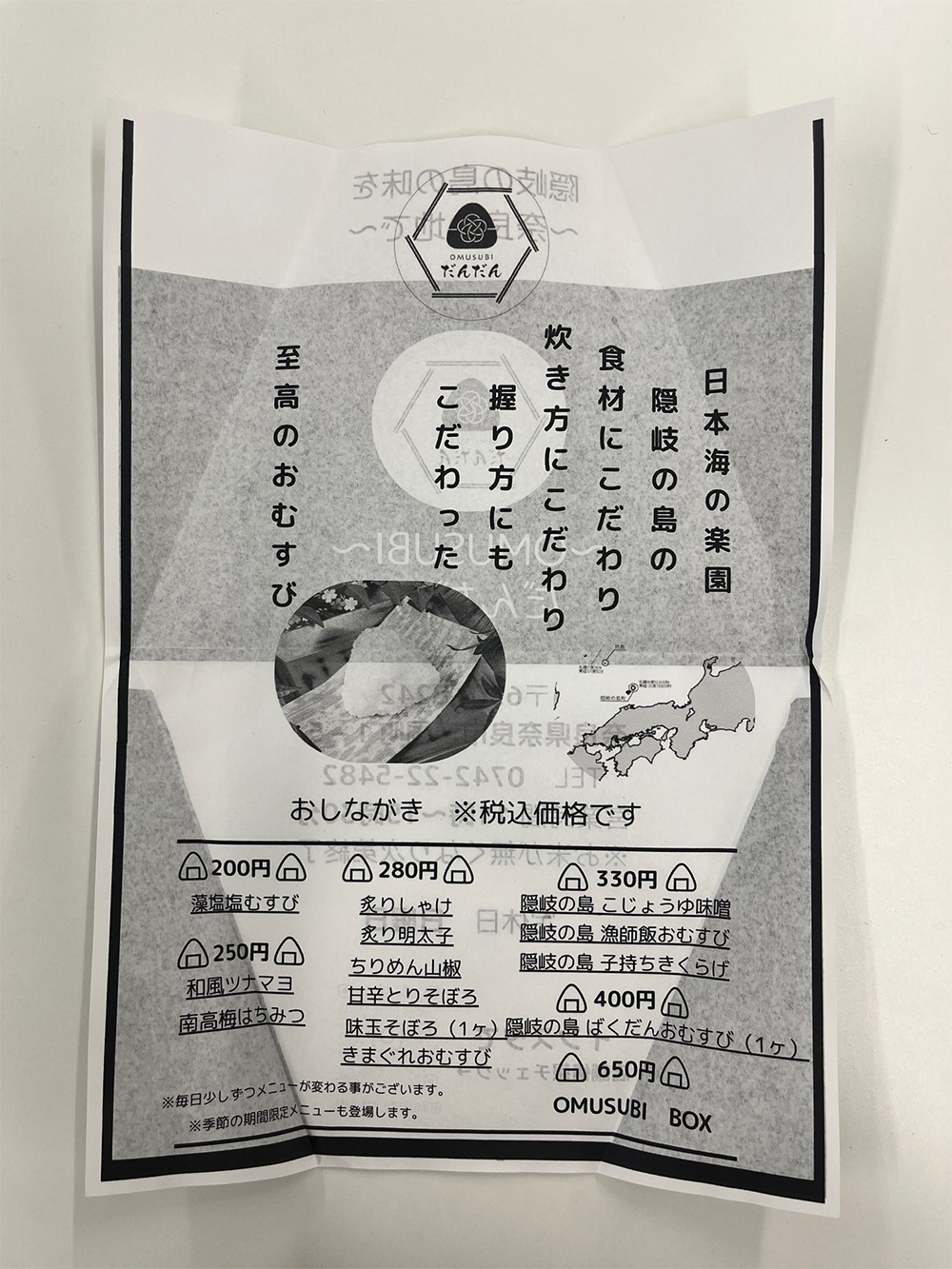 もちろん隠岐の島食材でない天然紅鮭・焼き明太子・和風マヨツナなどのおむすびもおいしく6種類取り揃えてあります。